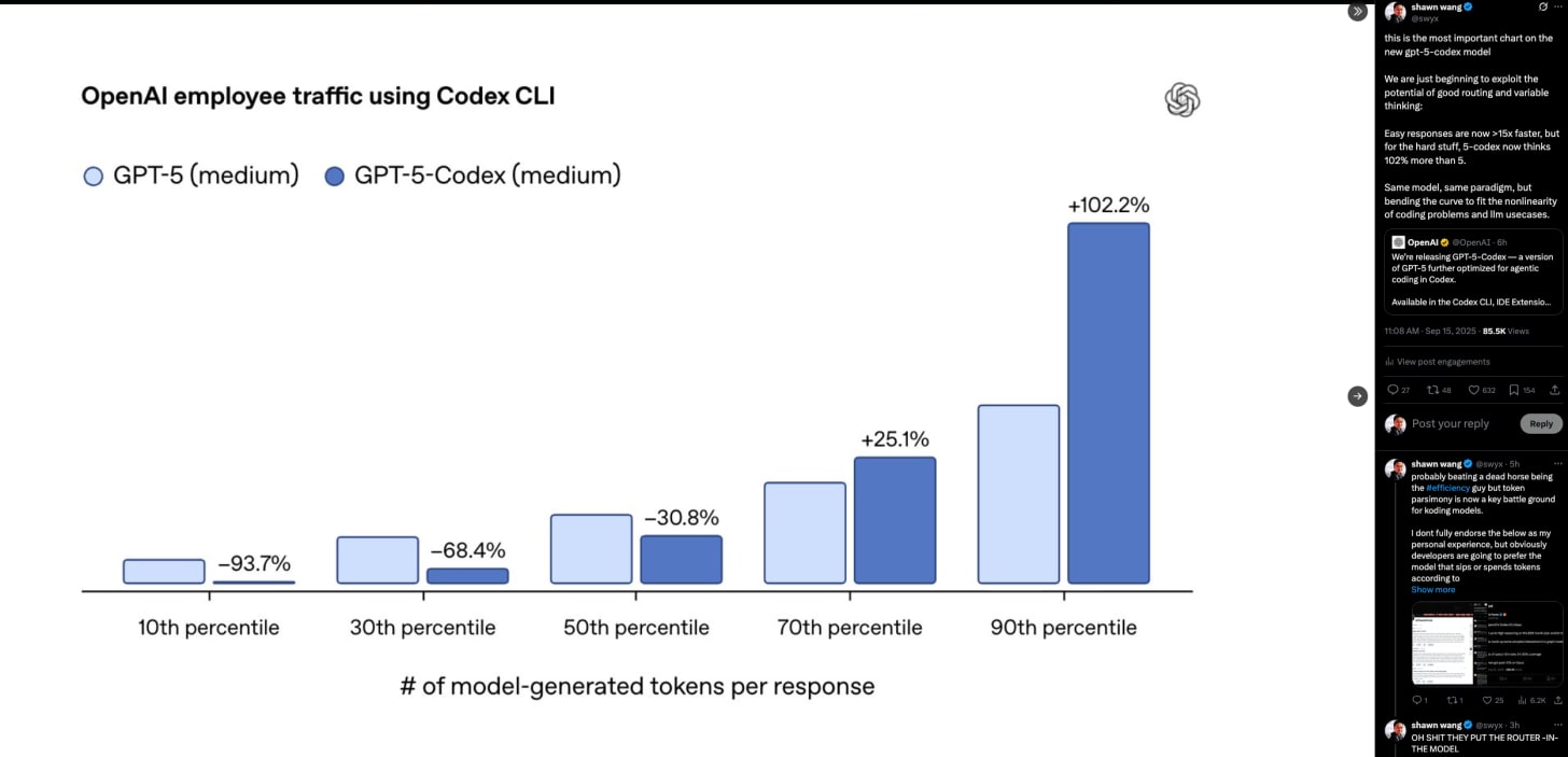 This tenacity judiciously applied is what makes GPT-5-Codex a much more useful agentic coding model all-round, not just optimizing for the most difficult problems only and then requiring a model switcher for dumber models (interestingly, it also doesn’t use ChatGPT’s GPT-5 Router we wrote about):
