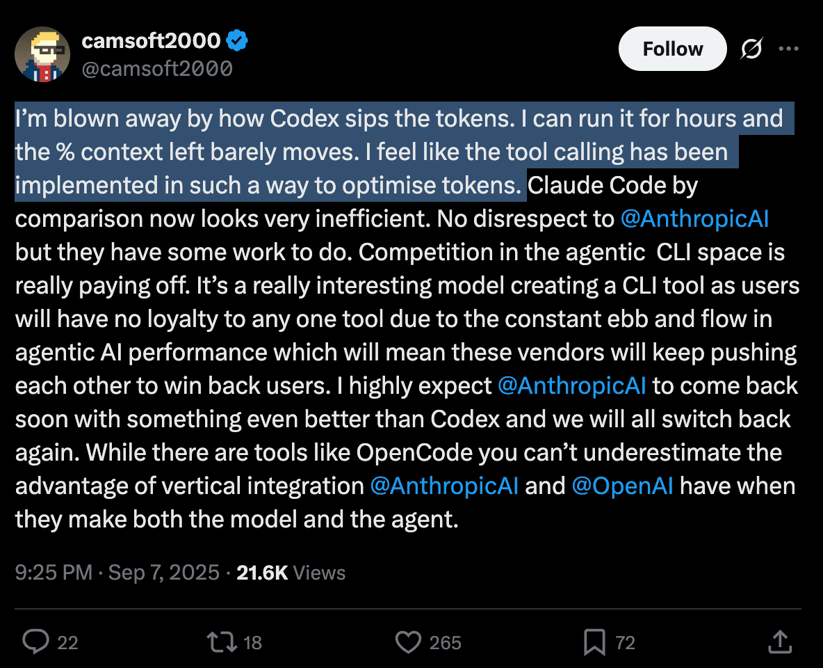 Codex is also particularly tuned for token efficiency here.
